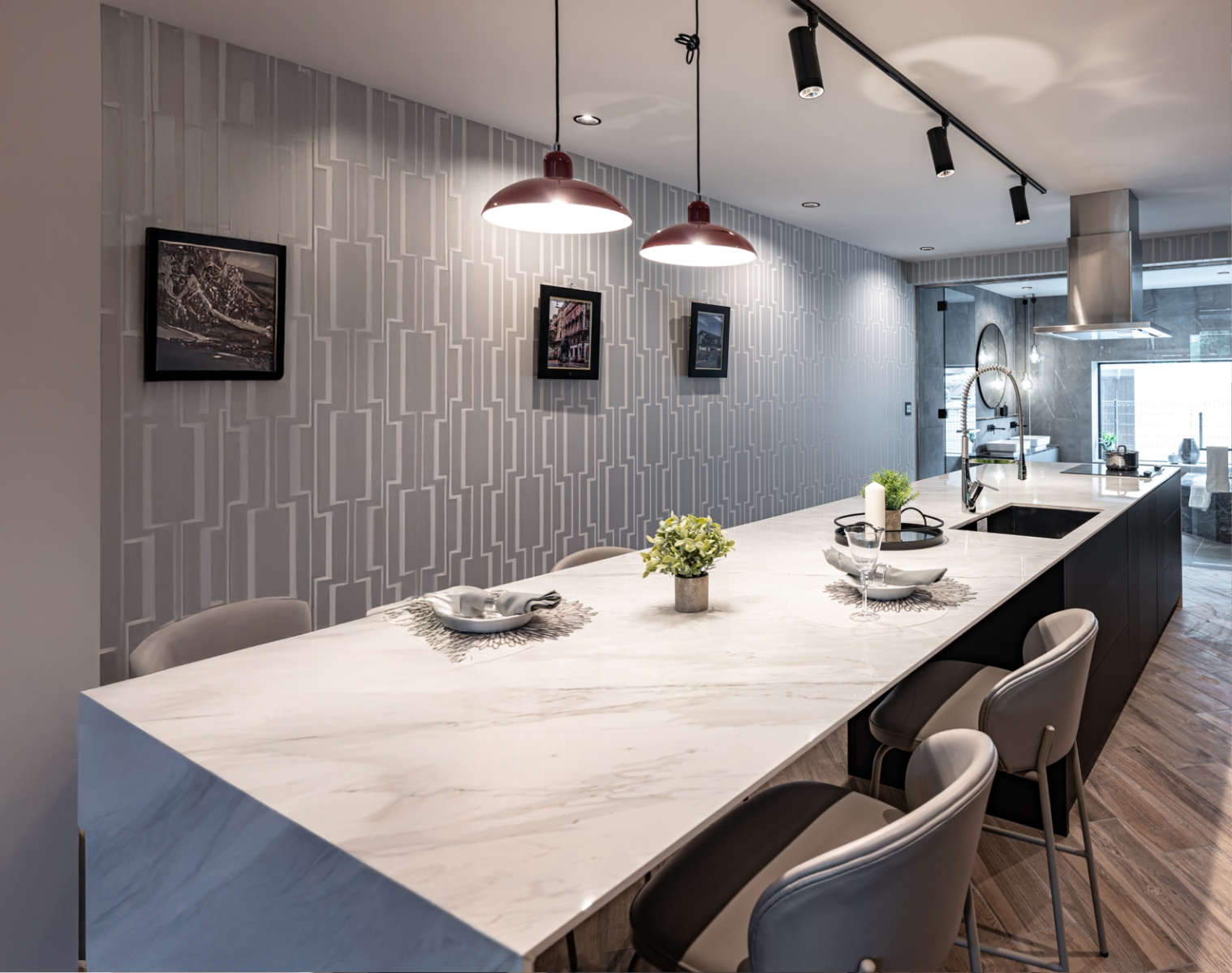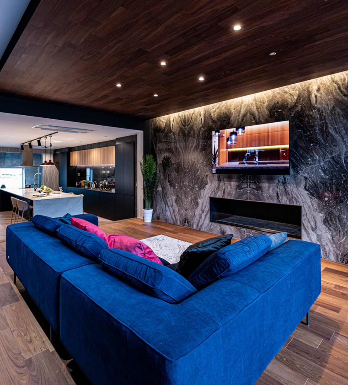 イタリアの大判タイルを使用した長さ5mのダイナミックなデザインのダイニングキッチン。